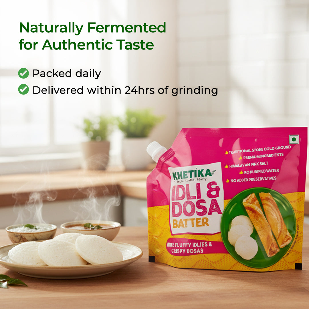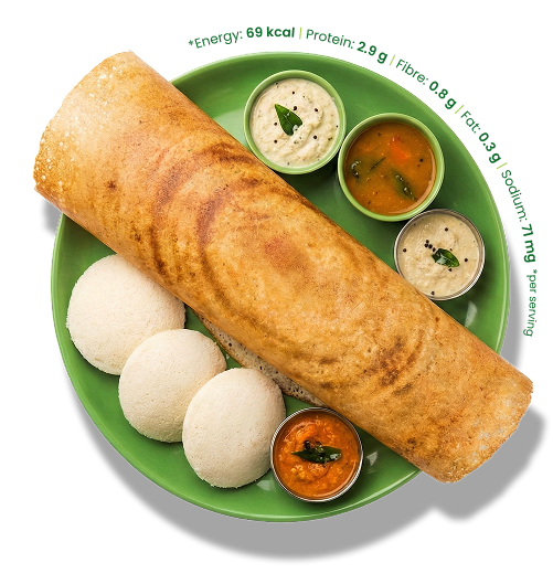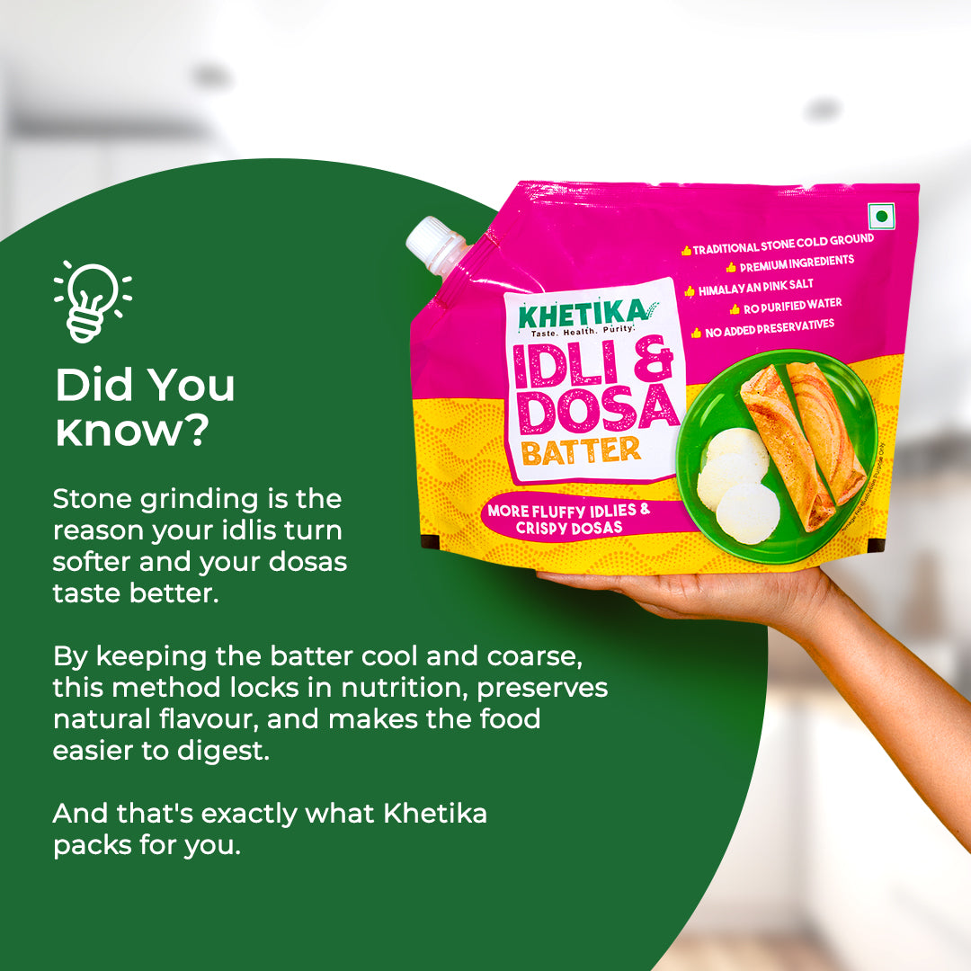 Stone-grinding does what machines can't; it keeps the batter cool, preserving natural moisture, oils, and that authentic fermented flavor South India is famous for. We grind rice and urad dal the slow way, so the vitamins stay alive and the taste stays real.