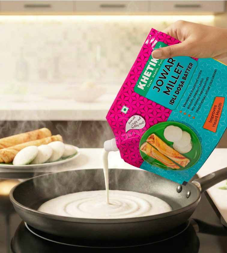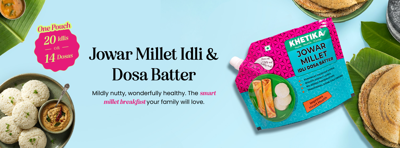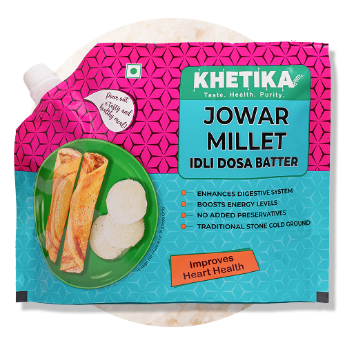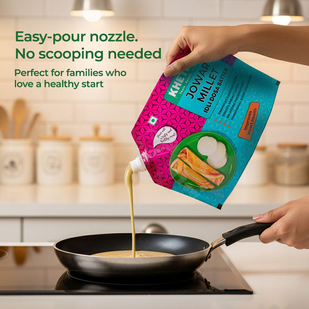 Soft fluffy jowar idlis for breakfast, thin crispy jowar dosas for lunch, or quick jowar uthappams for dinner. One pouch serves the family all day without any guilt.