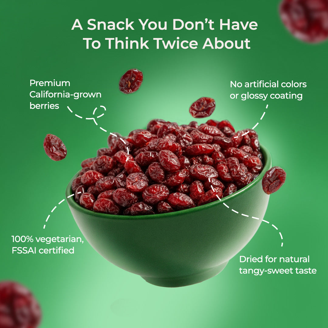 Juicy dried cranberries with refreshing sweet–tangy flavour that instantly satisfies your taste buds.