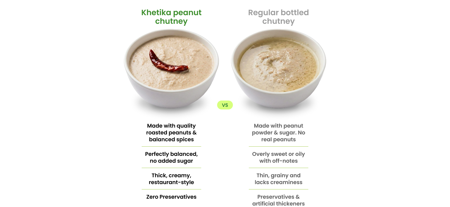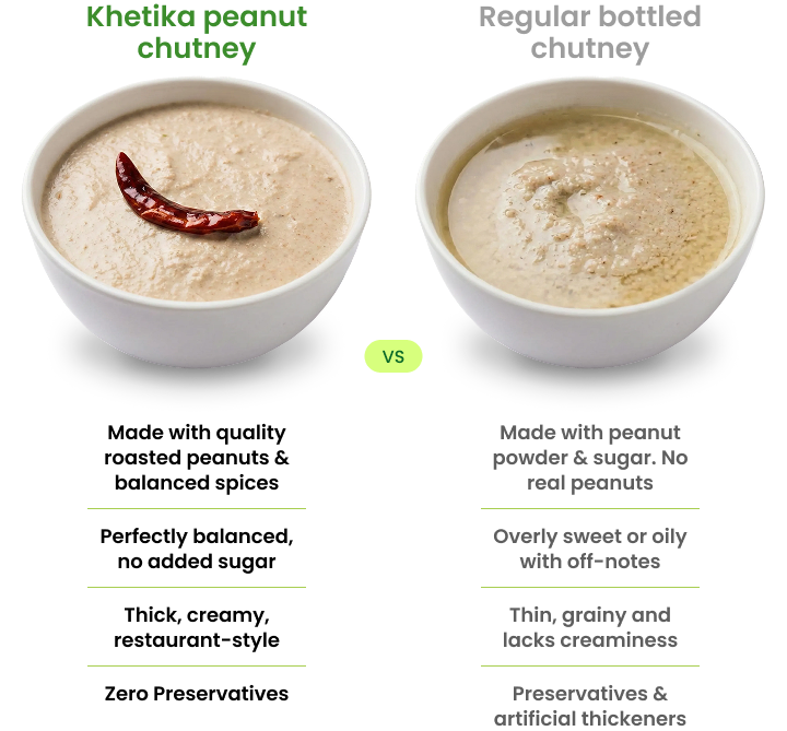 We roast whole peanuts fresh, then stone-grind them with green chillies and tamarind to release their natural oils and creamy texture. Unlike factory chutneys made from lifeless peanut powder and sugar, ours stays thick and nutty because real groundnuts are ground cool and slow. Made this week, packed this week, delivered to your fridge; not sitting in warehouses losing flavor.