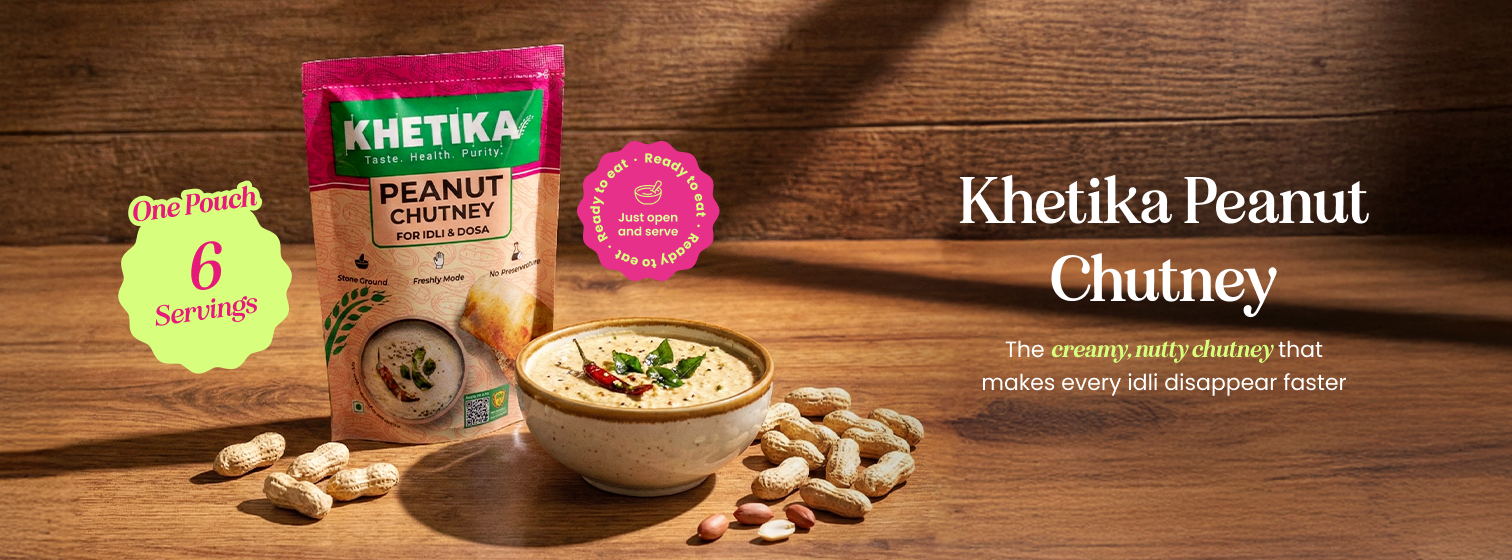 Khetika Peanut Chutney – thick, nutty, mildly spicy and full of roasted peanut flavour. Made with 27% real groundnuts, fresh green chilli, tamarind and a perfect tempering of curry leaves and mustard. This is the same chutney you never get enough of. No peanut powder, no sugar syrup, no preservatives; only real home-style taste in a pouch.