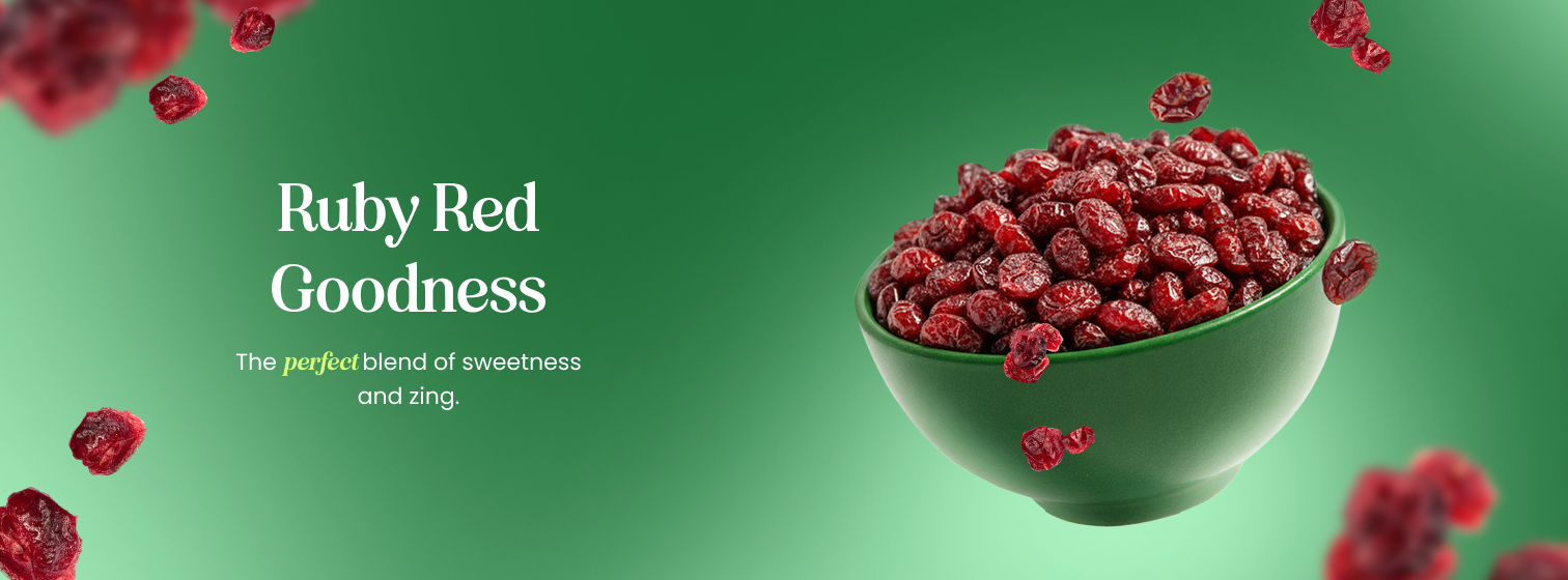 Juicy dried cranberries with refreshing sweet–tangy flavour that instantly satisfies your taste buds.