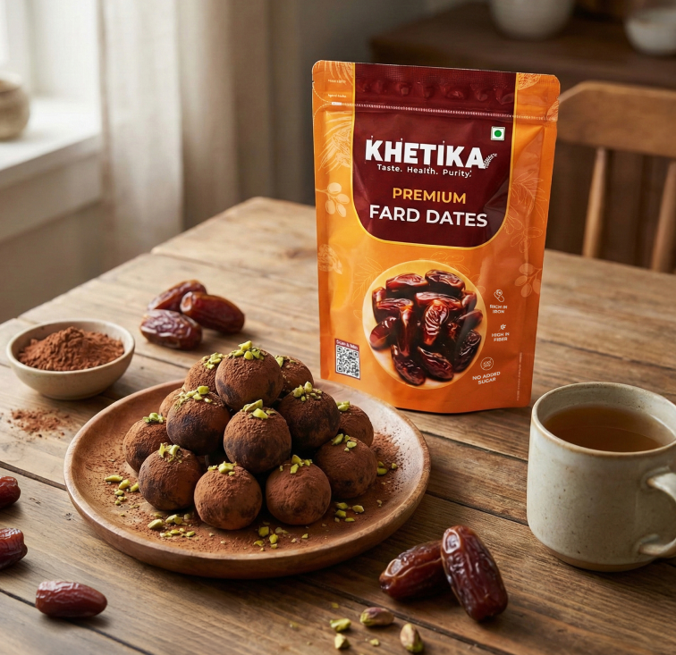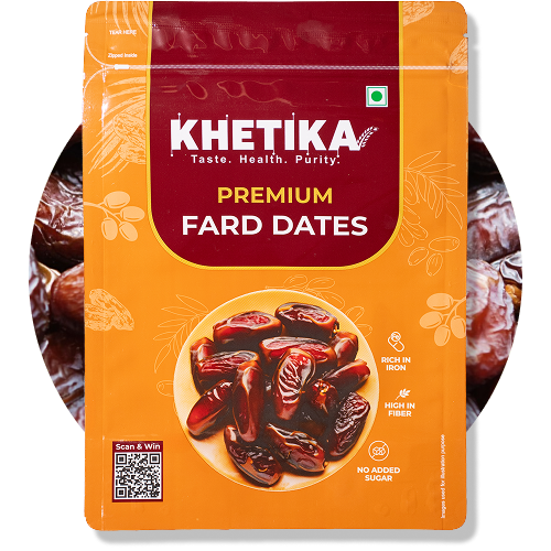 Experience the purity of Khetika’s Fard dates that provides balanced flavour and soft bite. Every piece is carefully selected to retain its natural nutrition and freshness. Whether you snack on them or add them to your creations, they make healthy eating simple and delicious.